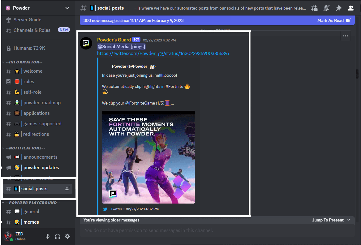I have set up a social posts channel in our community Discord server that automatically posts notifications of our Twitter(X) and Instagram posts. Therefore, all the users are then directed to our socials.